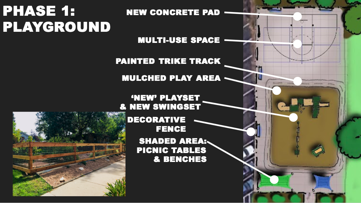 We want the playground to be a useable space for younger kids, older kids and as well as adults. The design has brought this vision with a new play area, multi-use concrete pad and a shaded area for the parents to hang out. We will have a new split rail fence installed around three sides of the play area. The eastern side of the play area will not have a fence and will be open from the grass to the play area. We believe this will be a space for relationships to be formed, established and reproduced throughout the future generations of our church family. Through the generous donation of play equipment, concrete, and labor we believe we can raise the funds and finish phase one by the fall of 2022!